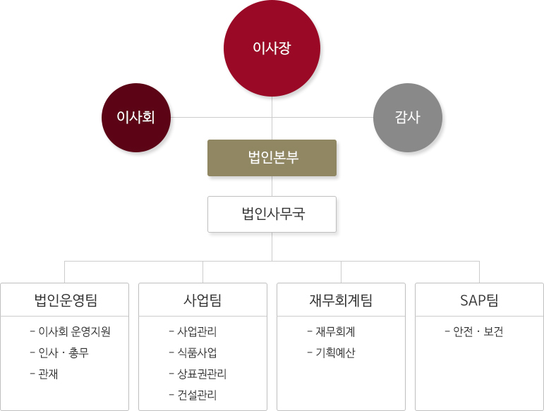 이러한 기능 수행을 위해서 법인 본부에는 법인운영팀, 사업팀, 재무회계팀, SAP팀 등의 부서를 설치, 운영하고 있습니다.